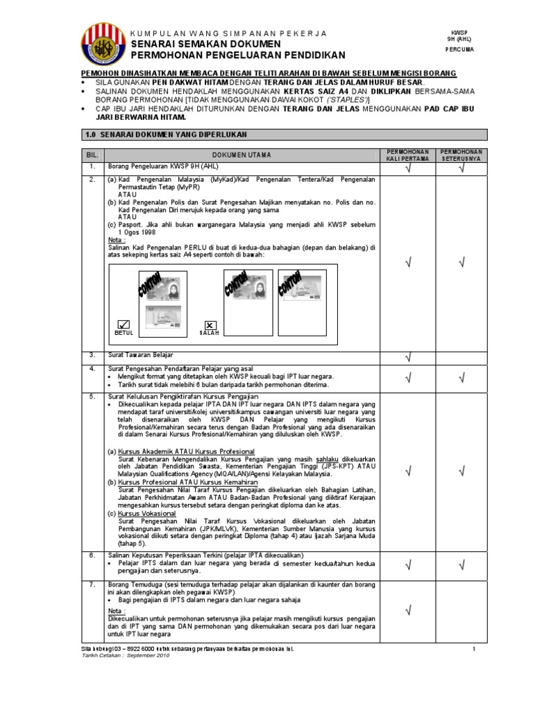 PANDUAN PERMOHONAN E-PENGELUARAN PENDIDIKAN KWSP SECARA ONLINE Dapatkan Kod Pengaktifan dengan hari. DOKUMEN YANG DIPERLUKAN Borang KWSP 9H AHL dan senarai semak dokumen. Terdapat 17 jenis pengeluaran KWSP yang perlu anda tahu.